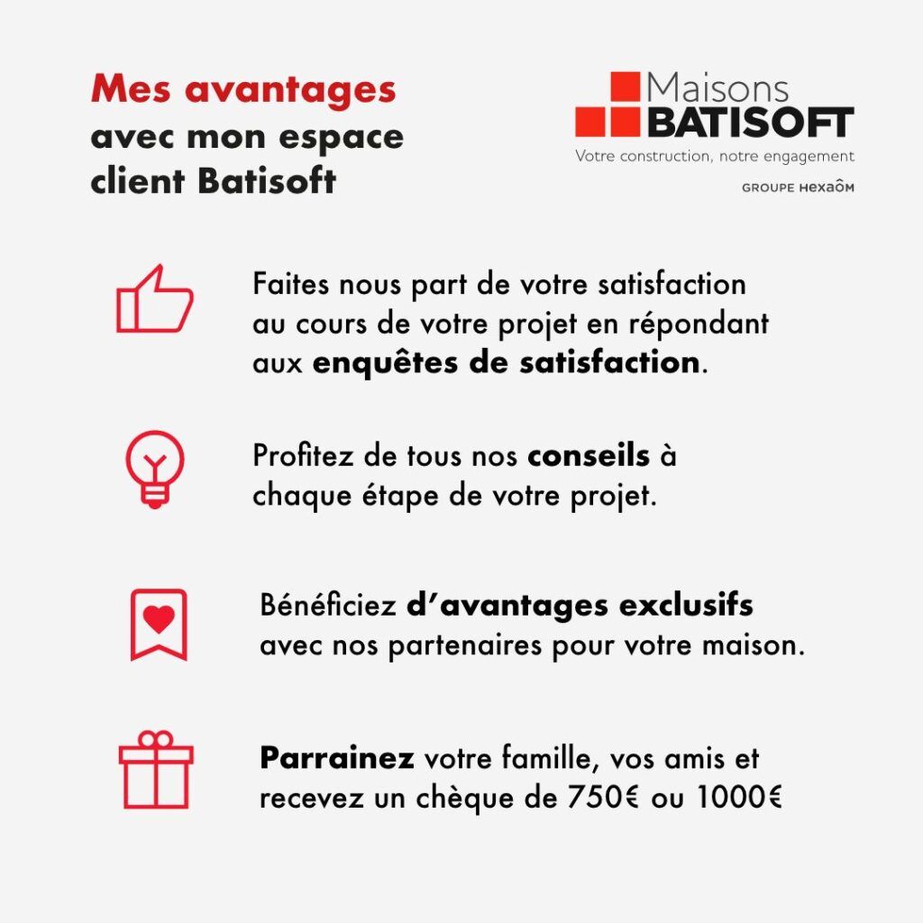 - D’autres avantages à venir avec des solutions d’éclairage, des panneaux solaires, des boîtes aux lettres connectées … Retrouvez toutes les offres exclusives Maisons Batisoft en contactant votre commercial.e.